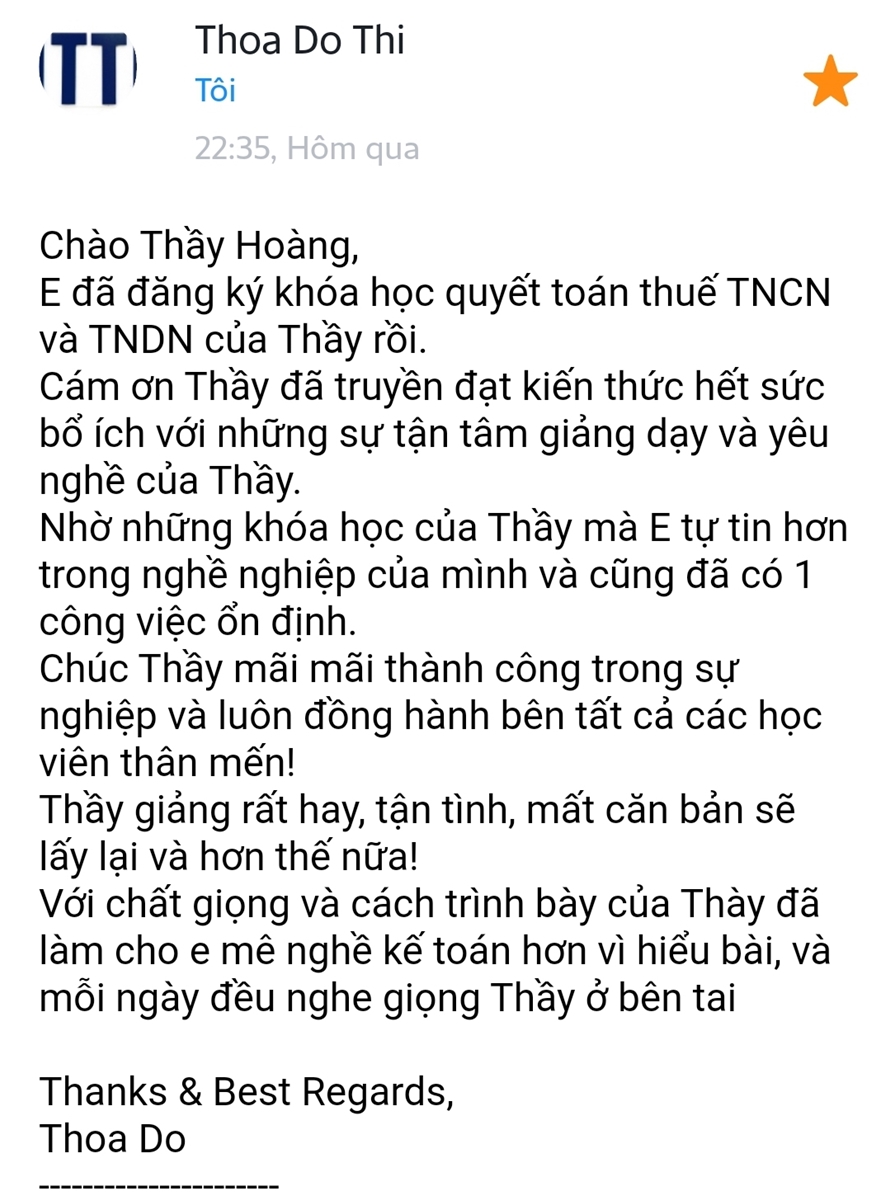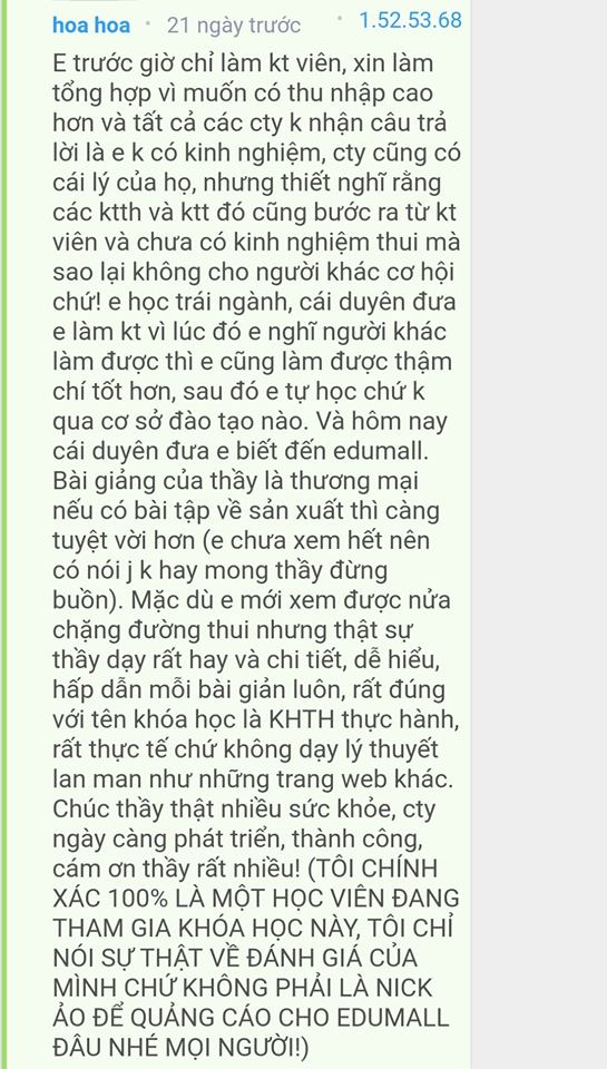 Cảm nhận của một bạn học viên tên Hoa trên hệ thống học online (chưa tìm được facebook của bạn)